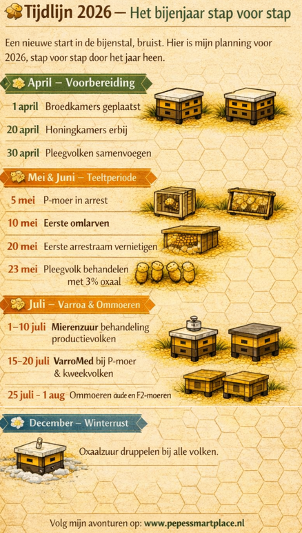 Er zijn van die dagen dat je de bijenstal binnenloopt en meteen voelt: dit wordt een mooi seizoen. De lucht ruikt naar voorjaar, de volken gonzen alsof ze het zelf ook weten, en ergens diep vanbinnen begint het te kriebelen — het teeltplan voor 2026 staat op het punt om los te barsten.