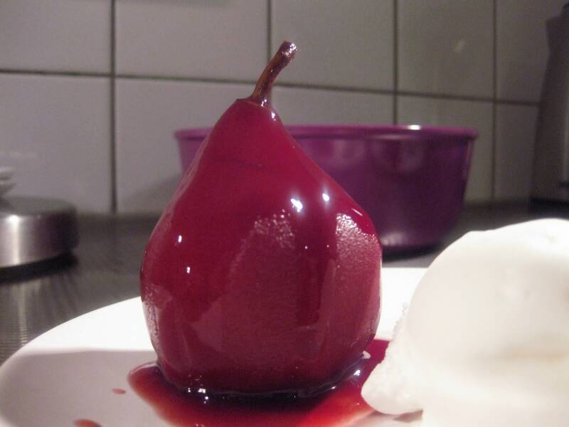 De peren zo veel mogelijk naast elkaar zetten. Kruitnagel en kaneelstokje toevoegen. indien nodig nog 1 glas wijn en 1/2 glas port toevoegen. de peren moeten zo veel mogelijk onder het vocht staan. 2 à 3 uur zachtjes rood stoven (pocheren). Laat de peren afkoelen in het stoofvocht.