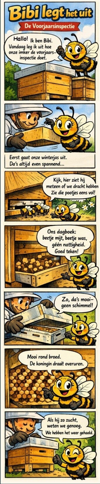 Hoi allemaal, Hier ben ik weer Bibi, het werksterbijtje van Volk 3. Vandaag vertel ik jullie hoe het eraan toegaat als onze imker — ja, die lange met die rustige handen — langskomt voor de voorjaarsinspectie.