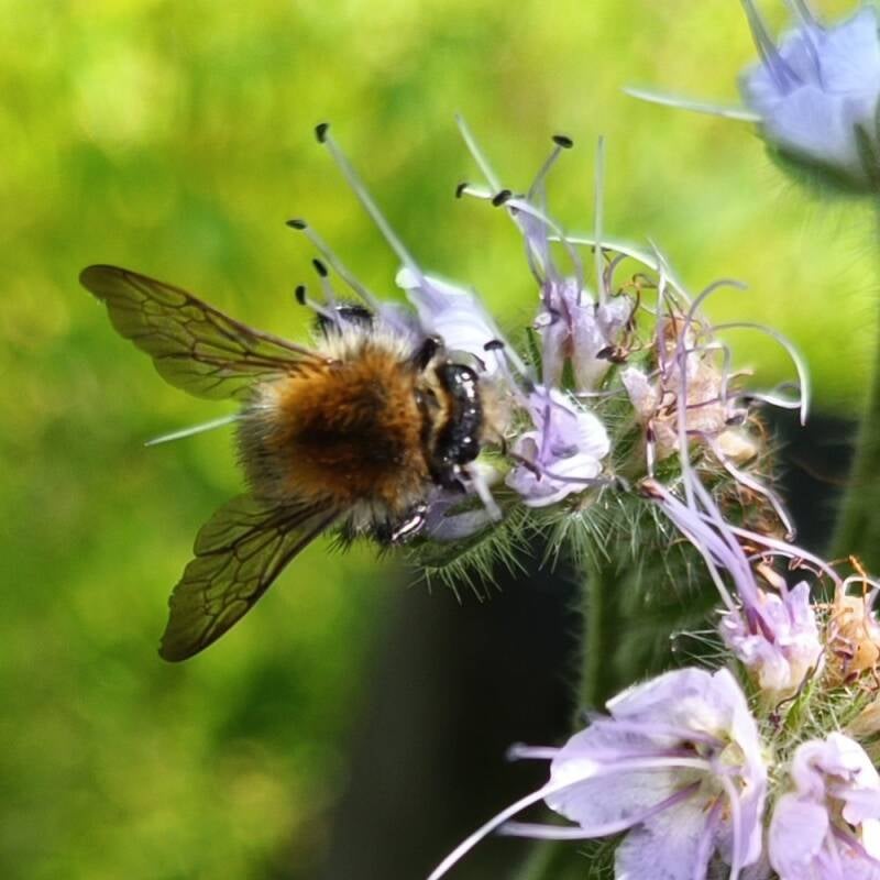 De akkerhommel is een zachtaardige en wijdverspreide hommel, goed herkenbaar aan zijn oranjebruine borststuk. Hij is niet alleen mooi om te zien, maar ook een belangrijke bestuiver in tuinen en op akkers. Ook op phacelia voelt hij zich zichtbaar thuis: de open bloemen bieden volop nectar en stuifmeel. Hij zoemt rustig van bloem naar bloem, druk verzamelend voor het nest.