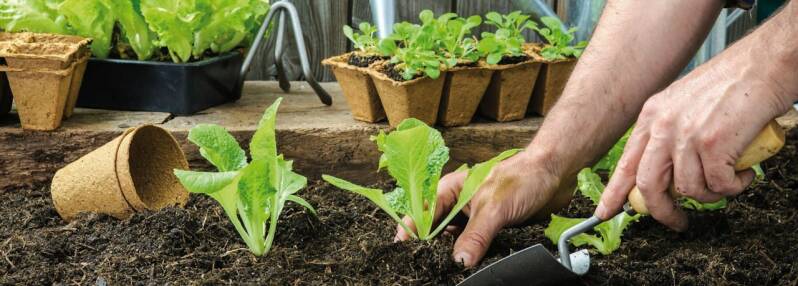 Buiten planten van de jonge afgeharde groenteplanten zoals koolrabi, bloemkolen en slasoorten.