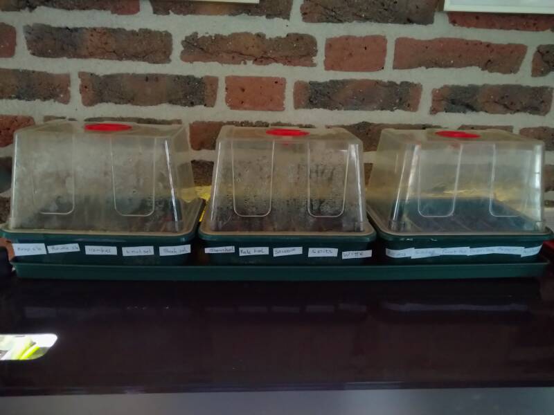 Ik zaai ze op mini regeltjes met steeds een saté stokje ertussen om ze van elkaar te scheiden. Het tropisch aquarium dient als propagator. Zodra ze opgekomen zijn gaan ze de kas in om langgroei te voorkomen.