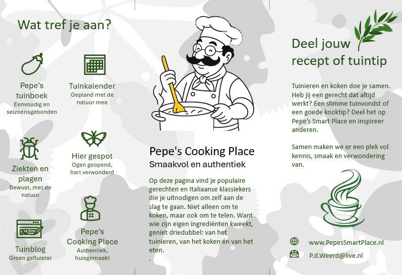 Om de tuin en website samen te brengen heb ik een nieuw leaflet gemaakt. Die ligt binnenkort op mijn fysieke tuin, zodat bezoekers daar kunnen ontdekken wat er online allemaal te vinden is. En andersom: wie online binnenwandelt, krijgt een uitnodiging om ook eens langs te komen in Casteren. Want Pepe’s Smart Place is niet alleen een website, het is een plek die leeft, zowel in de virtuele als echte wereld.